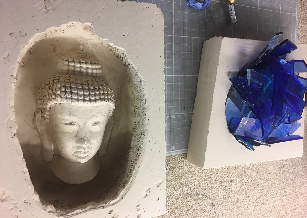 An opportunity to work with mould making to create simple but striking cast glass pieces, fired in the kiln. We will work on plaster based positives placed in the bottom of a refractory ‘box’ to create reverse relief effects in the glass. Glass is fired so that it flows over the forms and create a solid cast block. A deceptively easy way to work with the casting technique or to develop new ideas.