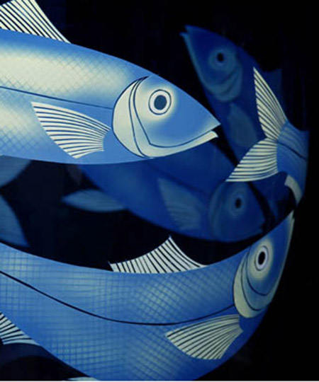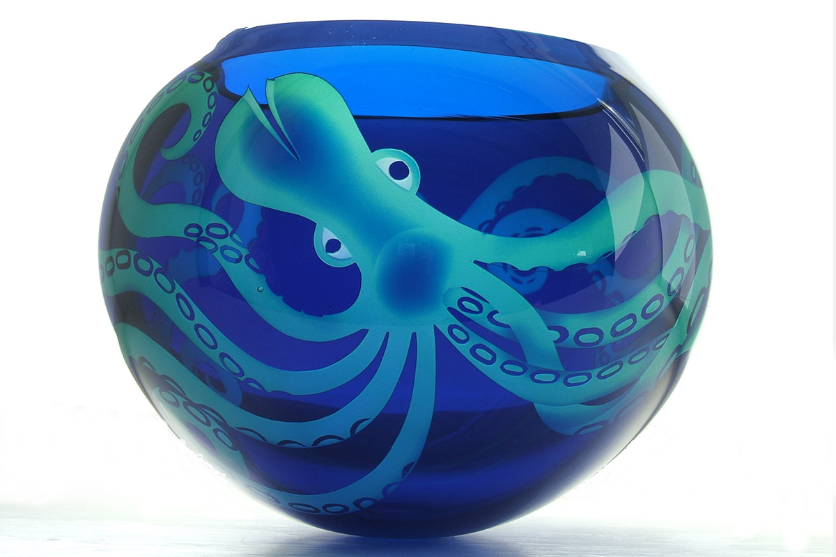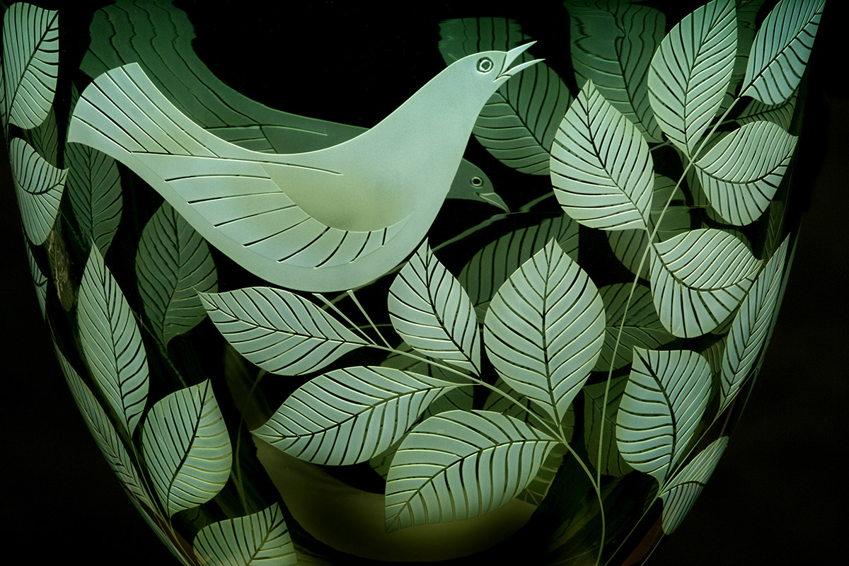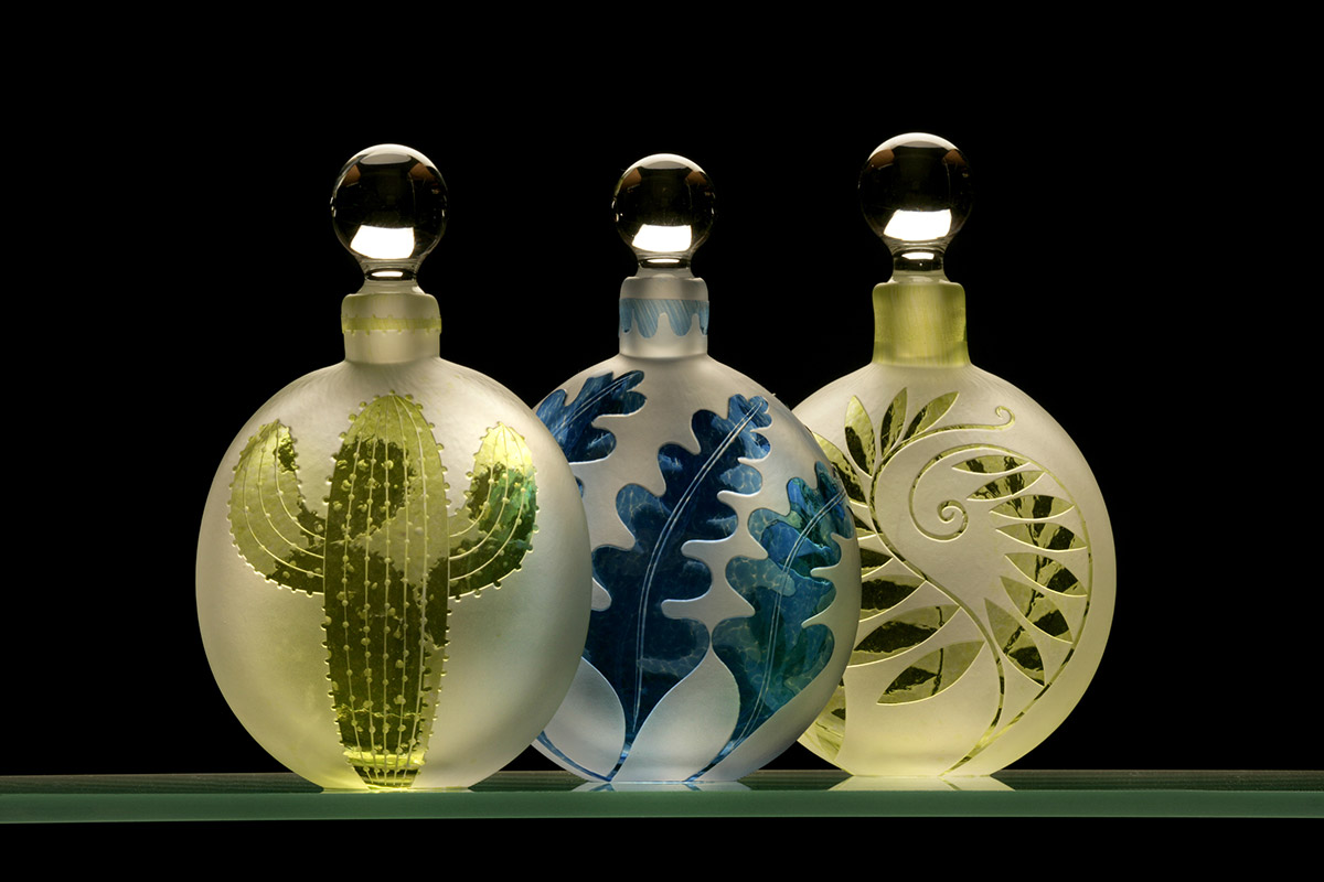 Ruth Dresman makes vessels in coloured glass, with sandblasted design which emphasise the colour transparency and translucency of the material. She has evolved a distinctive technique which is exclusive to her studio, based on the controlled removal of layers of coloured glass to describe her designs.