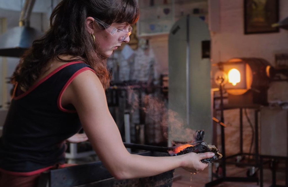 We offer a range of options for those who wish to further their glassmaking skills including 1:1 and bespoke group tuition, together with studio and equipment hire. Our facilities in the hot-shop and the kiln room together with cold-working equipment and a sand-blaster are available to hire.